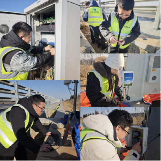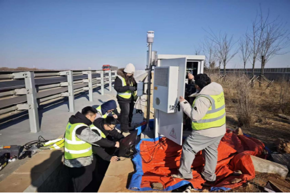 外场作业的艰辛,在寒冬时节尤为凸显。为尽早联通感知网络,让监测系统发挥作用,团队多次在凛冽寒风中赶赴现场,开展外接监测机柜的最终连接与系统调试工作。京哈高速旁,刺骨的寒风如刀割般刮过脸颊,指尖在冰冷的金属接口与纤细线缆间早已僵硬麻木,却始终稳稳操控着仪器;冻得通红的脸上,双眼始终紧盯屏幕,仔细核对每一组信号、采集每一个初始数据。