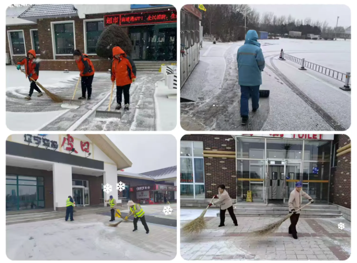大连分公司各服务区工作人员迅速就位,第一时间设置温馨提示标志,全员投入除雪作业,重点对人行通道、公厕门前进行了全面扫除,各部门协同作战,形成除雪保畅的强大合力。