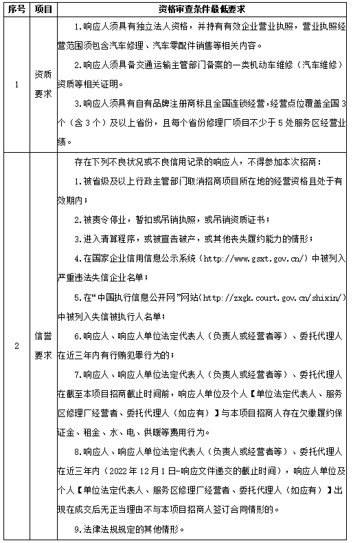 3.1本次招商要求响应人必须同时具备的资格要求详见下表: