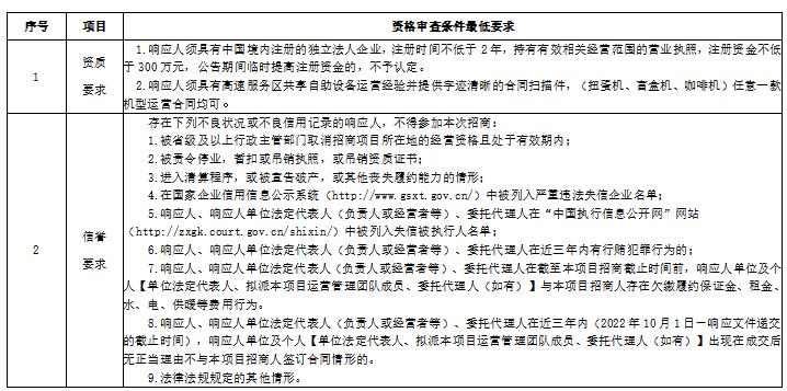 3.1本次招商要求响应人必须同时具备的资格要求详见下表: