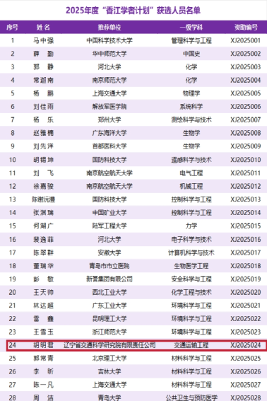 近日,由科研院博士后科研工作站主导,联合大连理工大学博士后流动站共同培养的博士后胡明君成功入选2025年度“香江学者计划”。作为全国交通运输工程一级学科领域该年度唯一获此殊荣的博士后,胡明君的成功入选彰显了公司人才培养工作成效与实力。