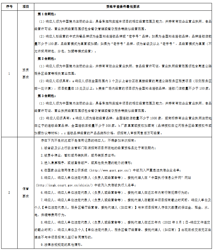 2.1项目概况:为满足经营需要,现对辽宁省高速公路辽河服务区中式快餐、美食广场和水吧经营业态进行公开招商。
